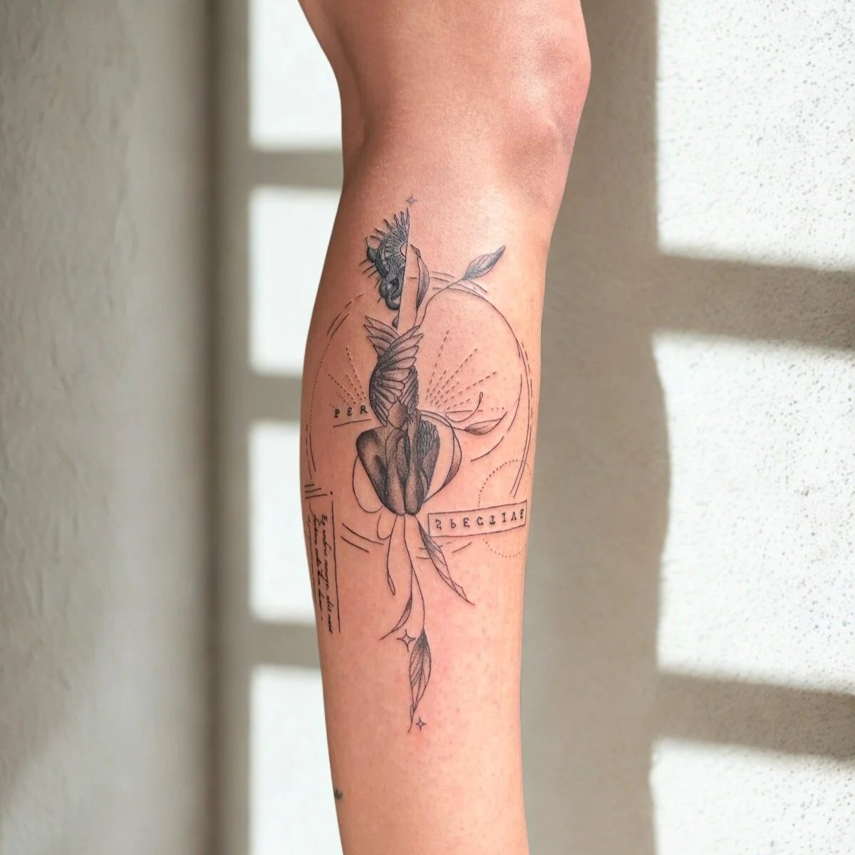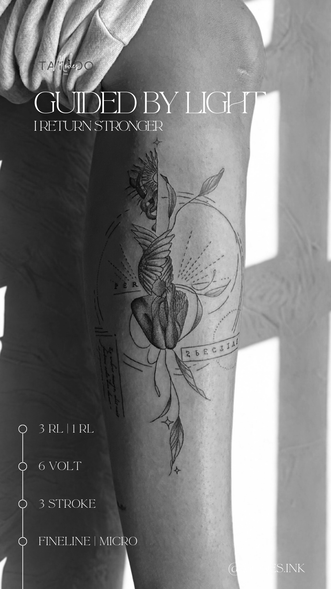 Guided by Light ist mehr als ein Tattoo – es ist ein persönliches Bekenntnis. Ich habe mir dieses Motiv selbst gestochen, als bewussten Akt der Selbstermächtigung und des Vertrauens in meinen Weg. Die Worte erzählen von Transformation, innerer Stärke und Neubeginn: von meiner Seele, die sich aus der Dunkelheit erhebt, mit eigenen Flügeln wächst und sich vom Licht leiten lässt. Es steht für Durchhalten, Weitergehen und das Wiederfinden der eigenen Perspektive. Die Platzierung ist bewusst roh. Nicht jede Linie ist perfekt, nicht jede Stelle war gut erreichbar. Und genau deshalb liebe ich dieses Tattoo so sehr -weil es echt ist. Weil es meine Hand war, die es erschaffen hat. Mein eigenes Werk an mir selbst.